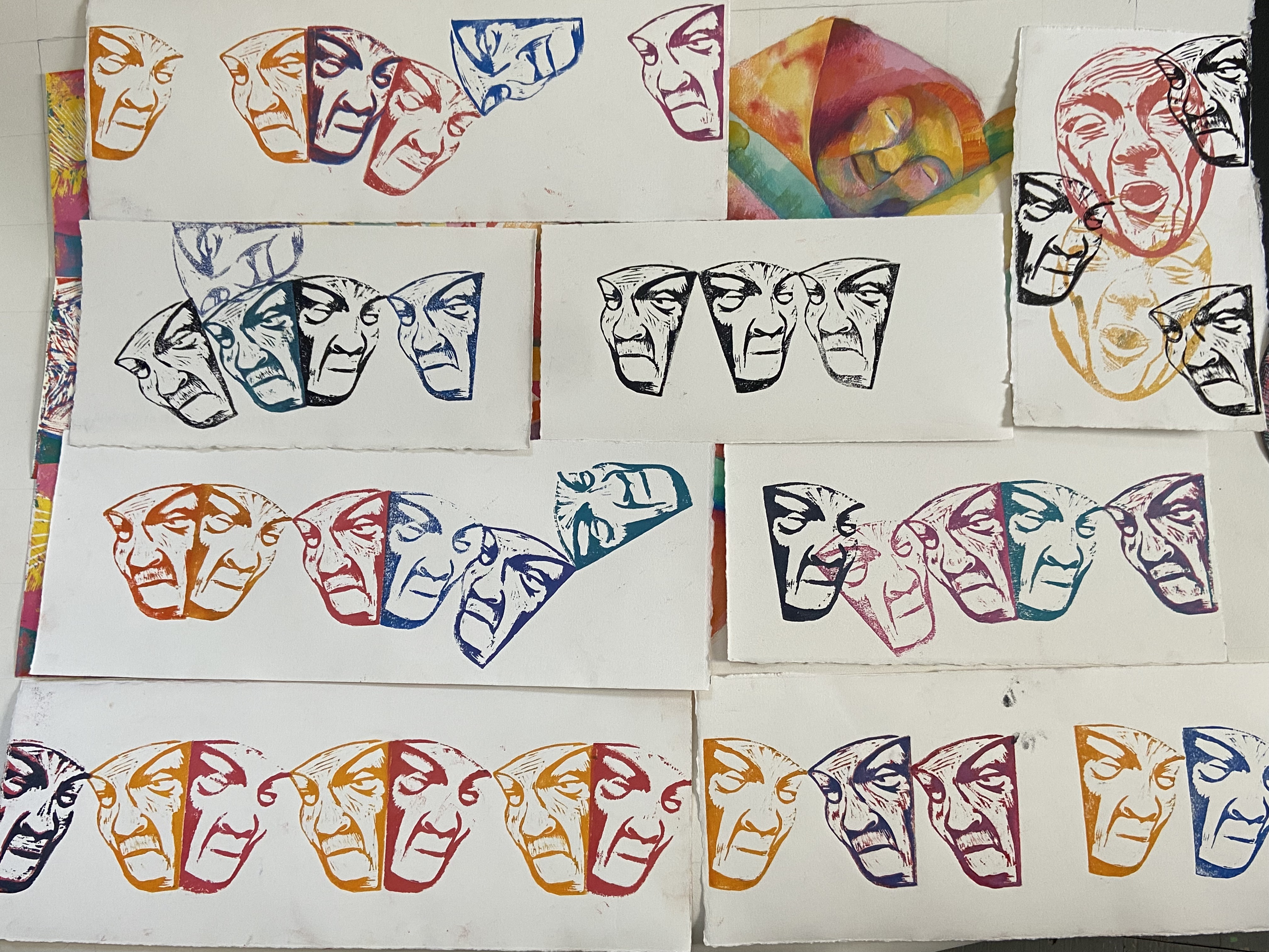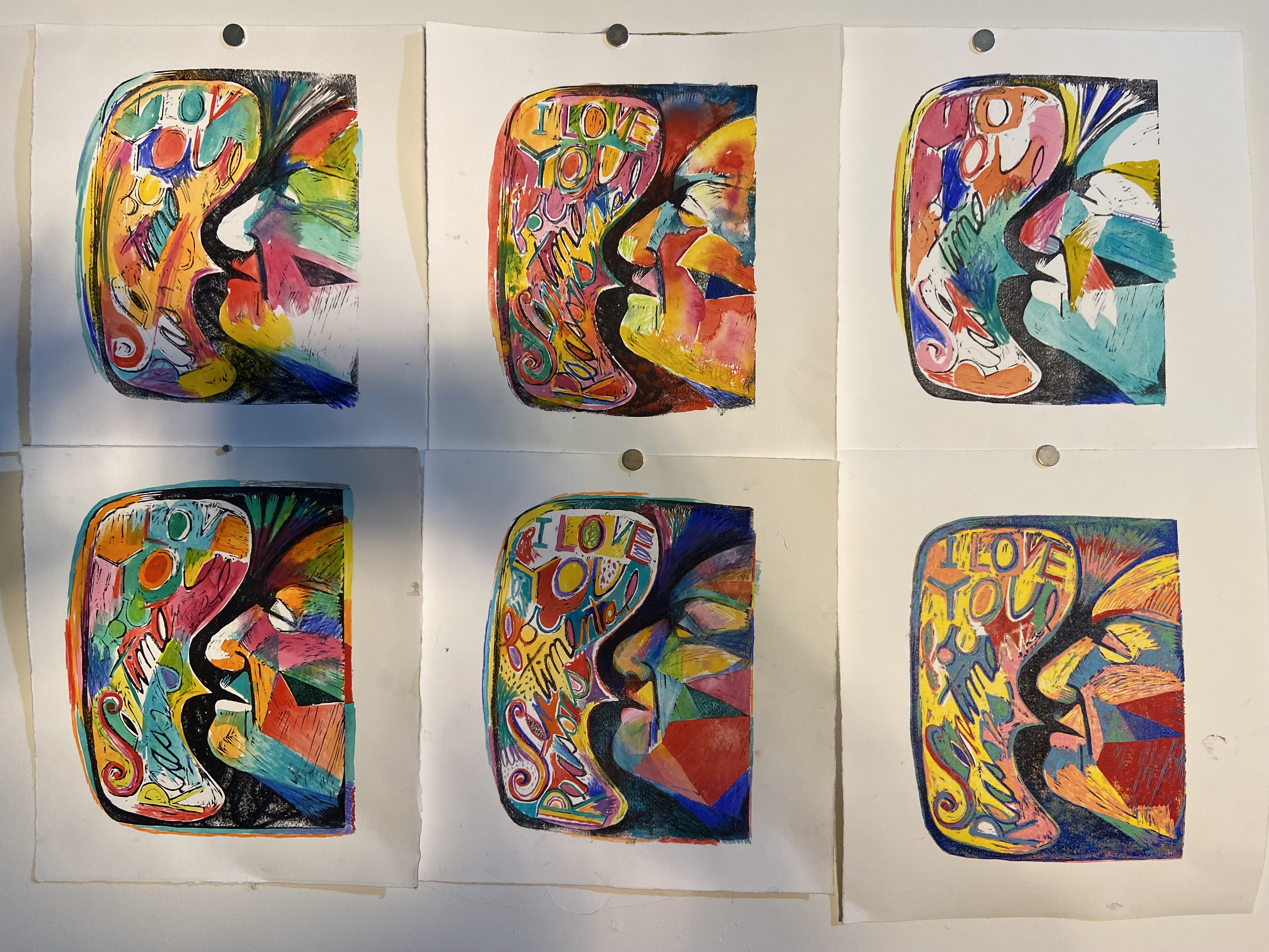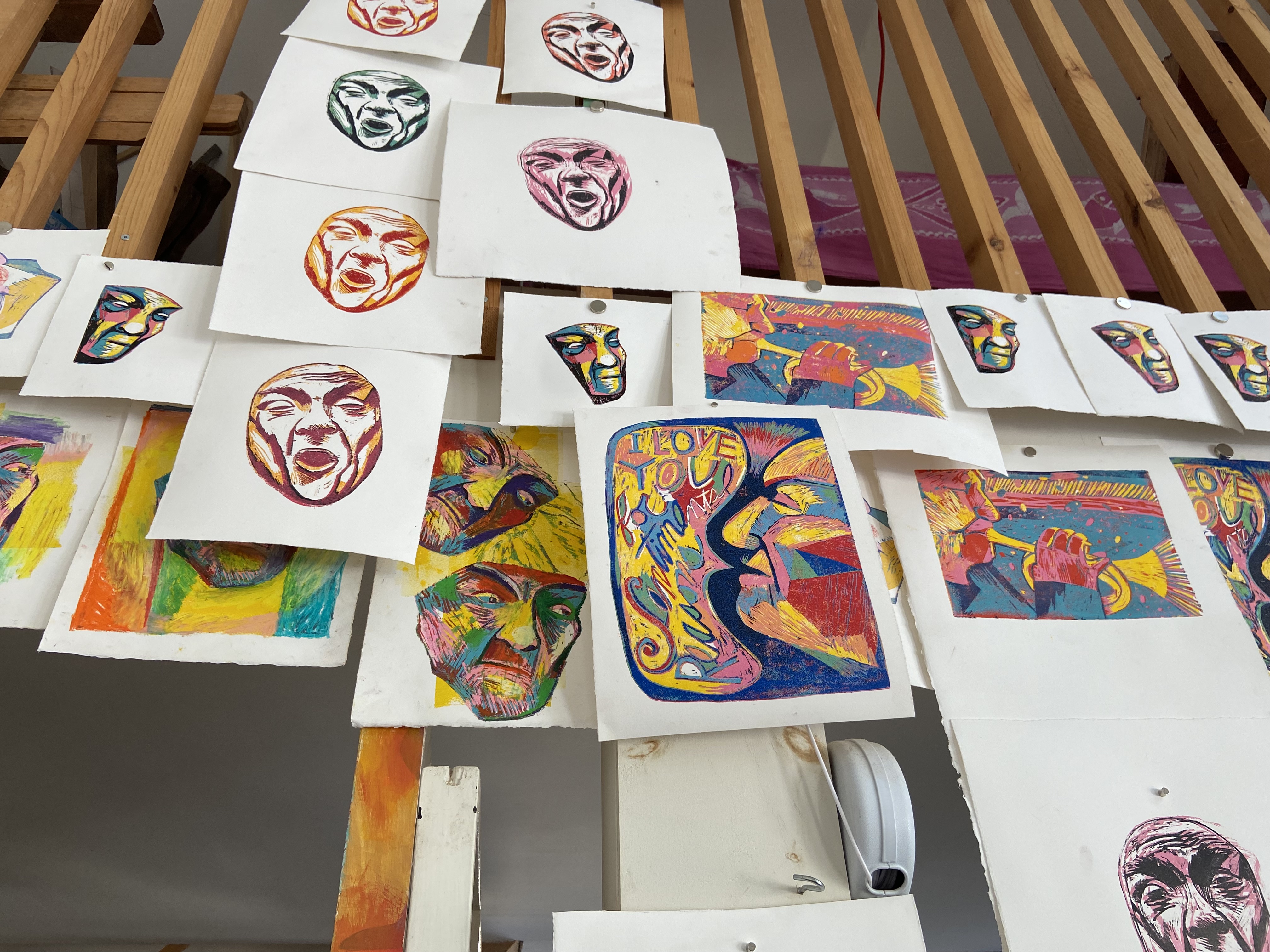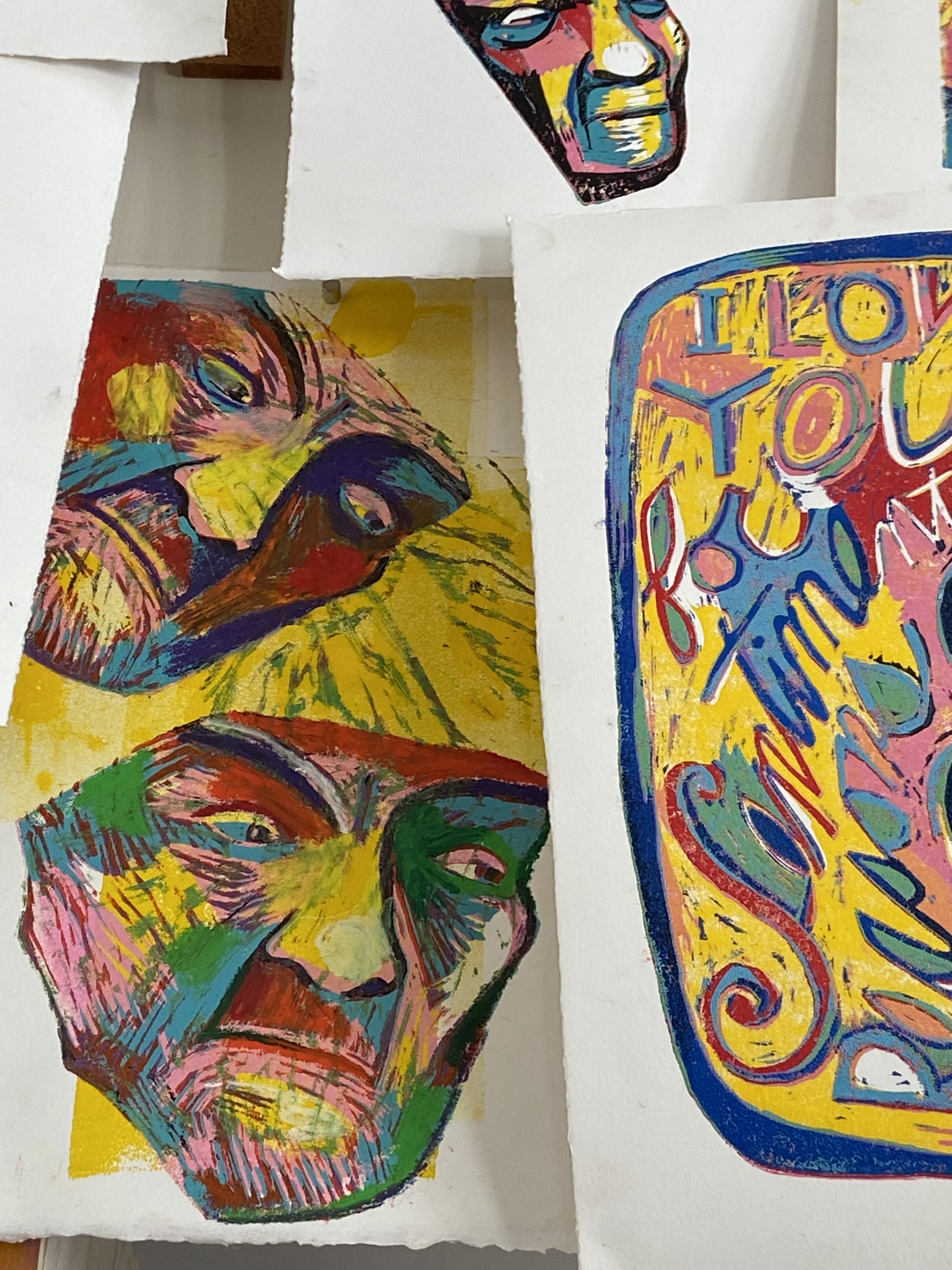 reduction linoprints, monoprints, linoprints with drawing and painting added and collages