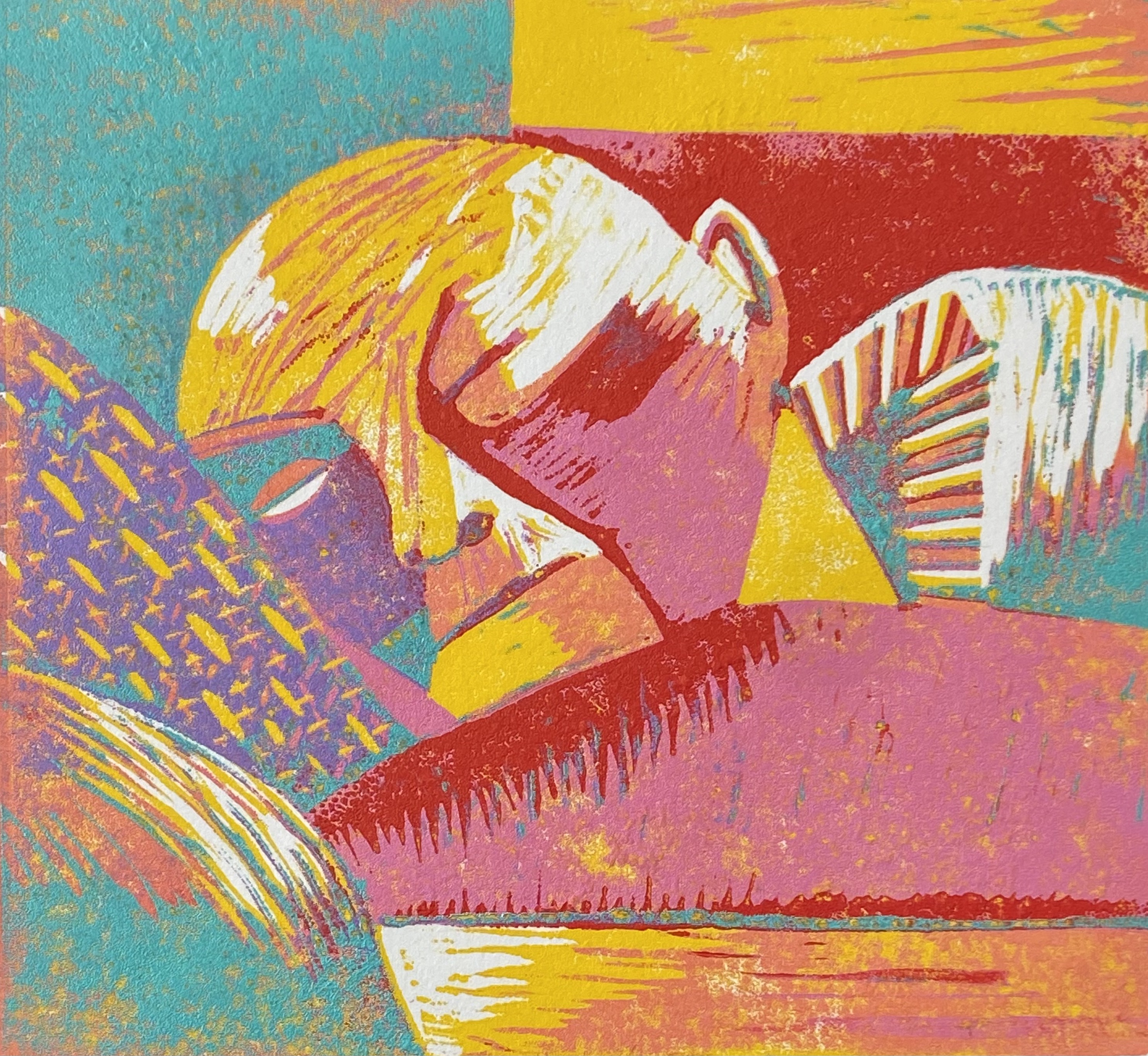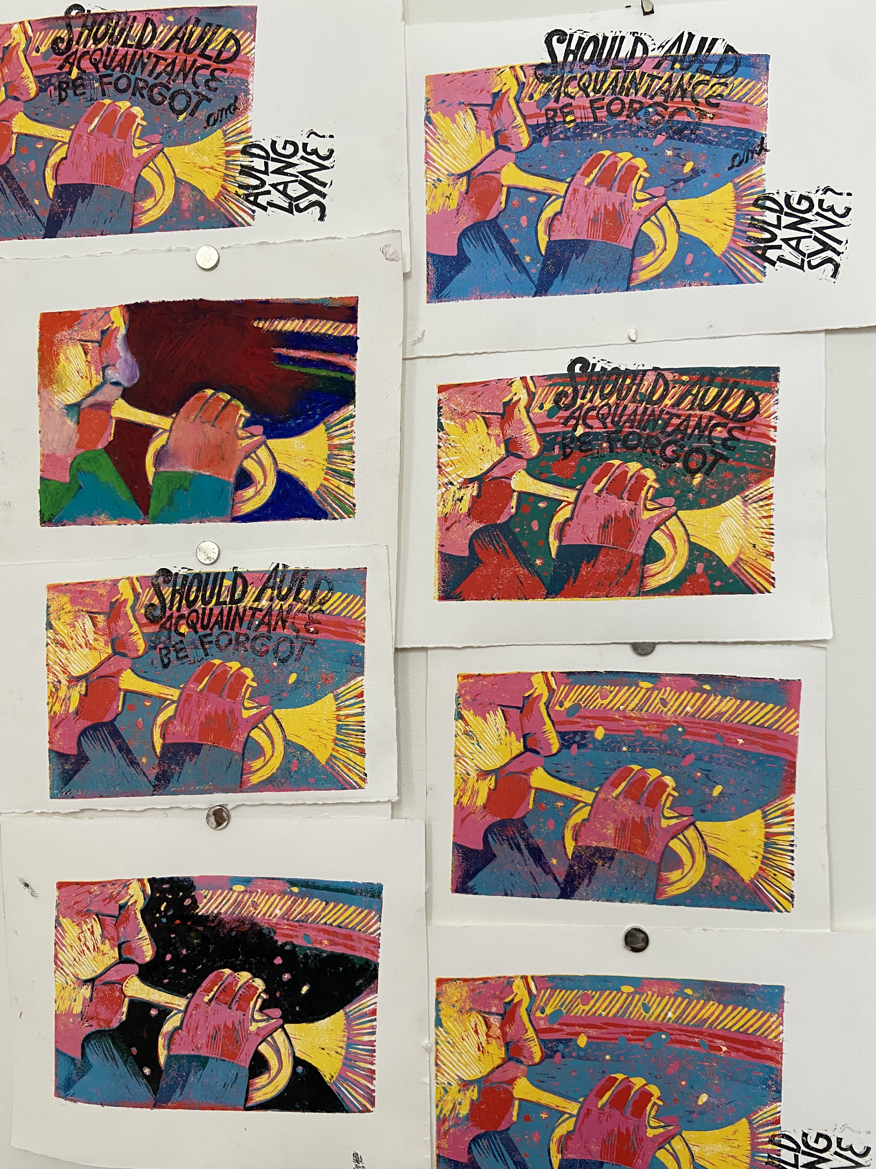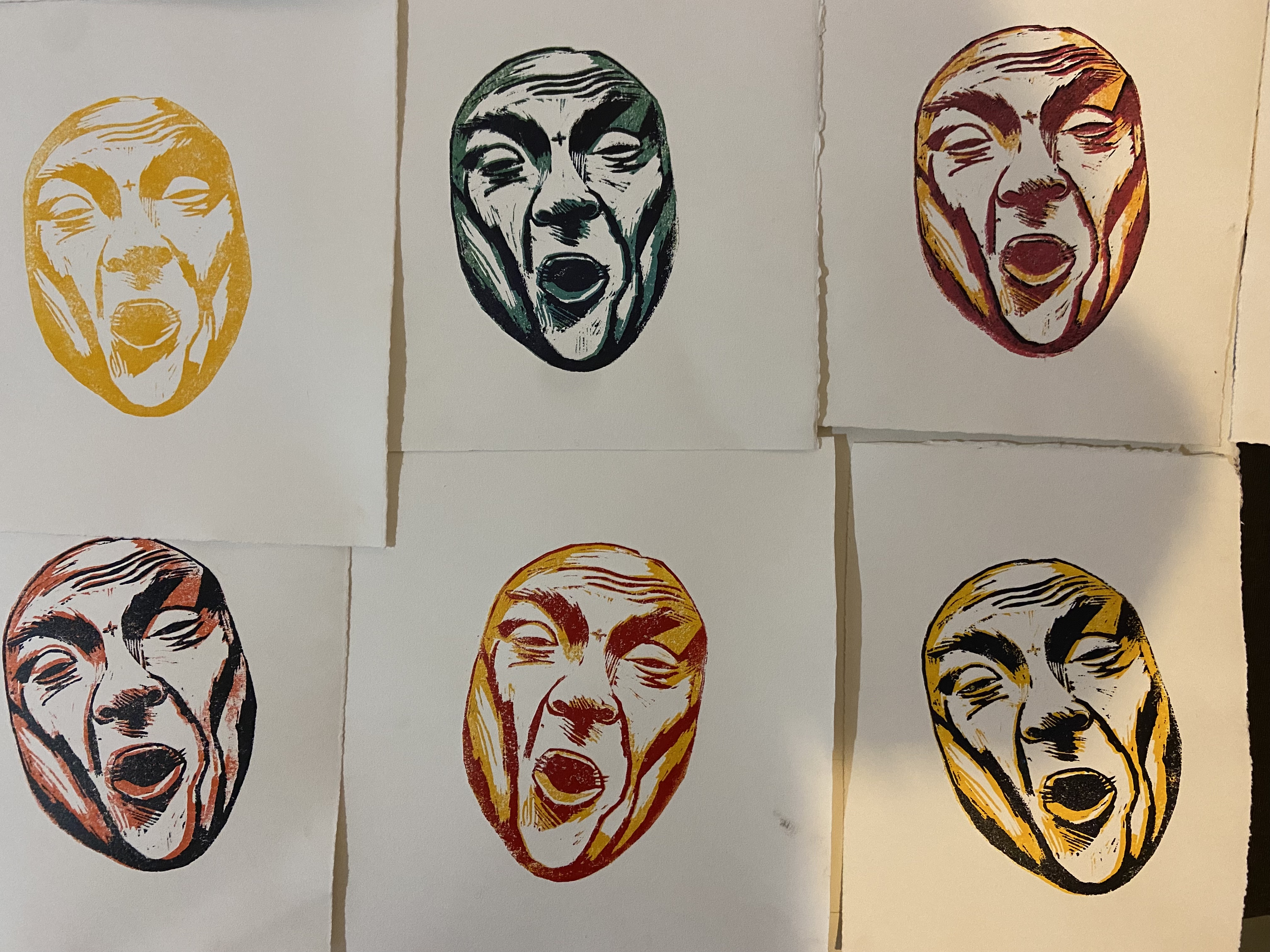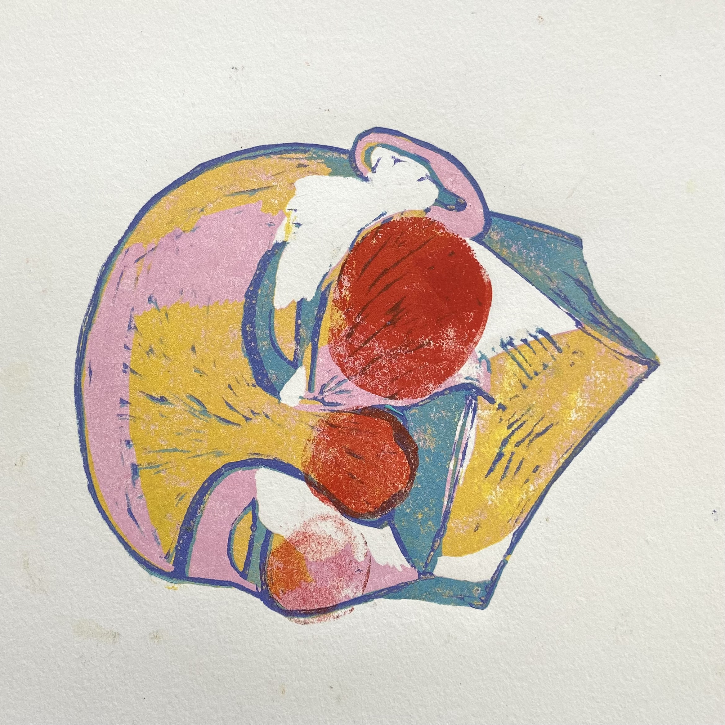 reduction linoprints, monoprints, linoprints with drawing and painting added and collages