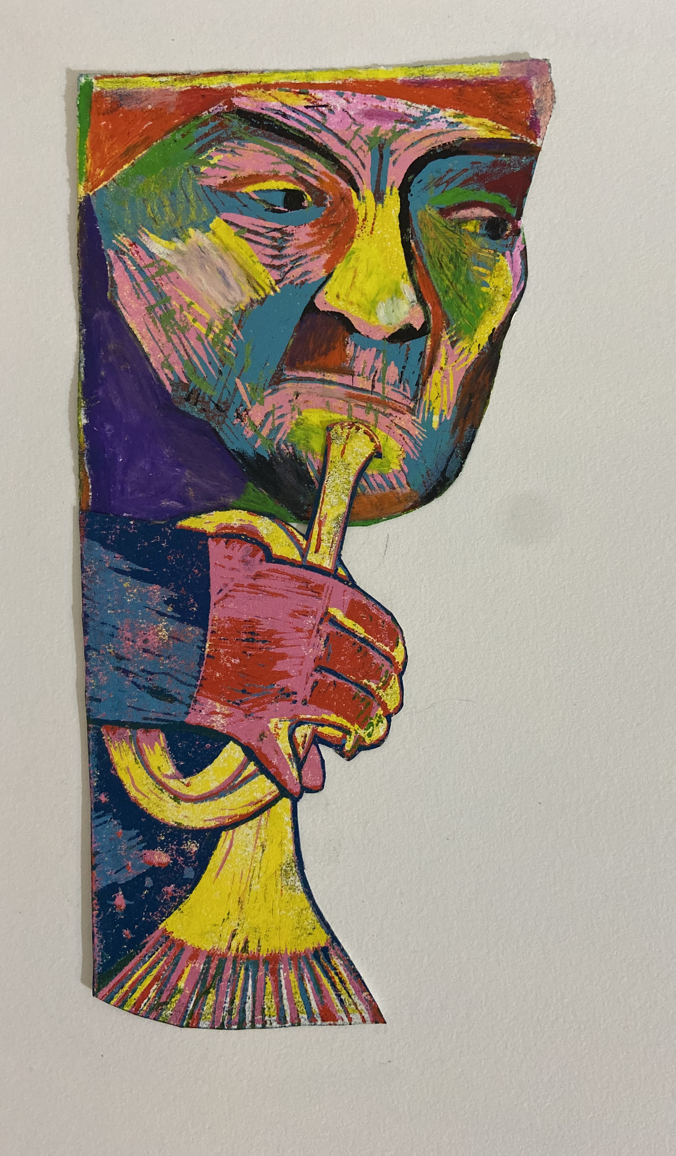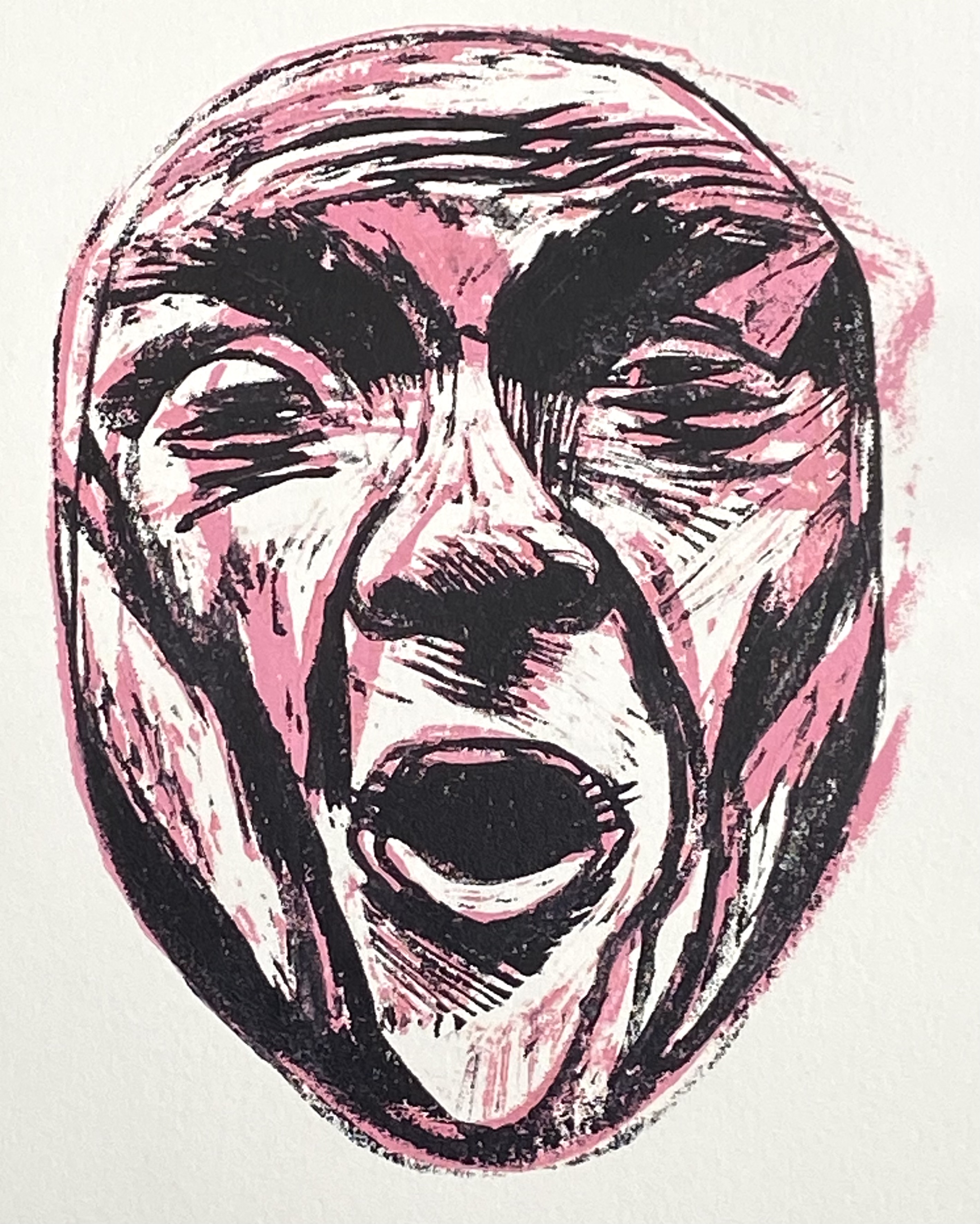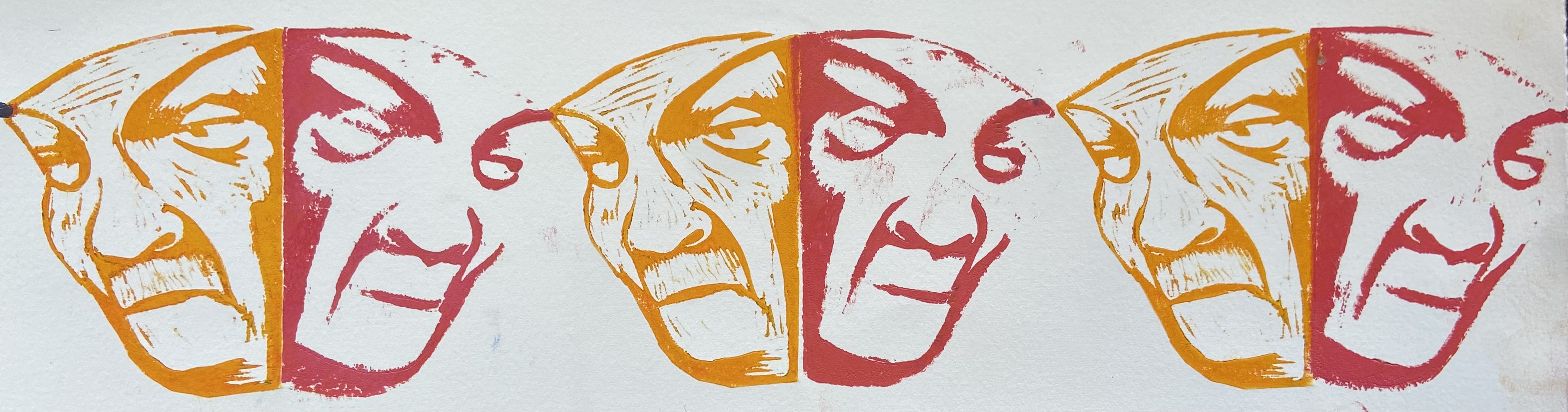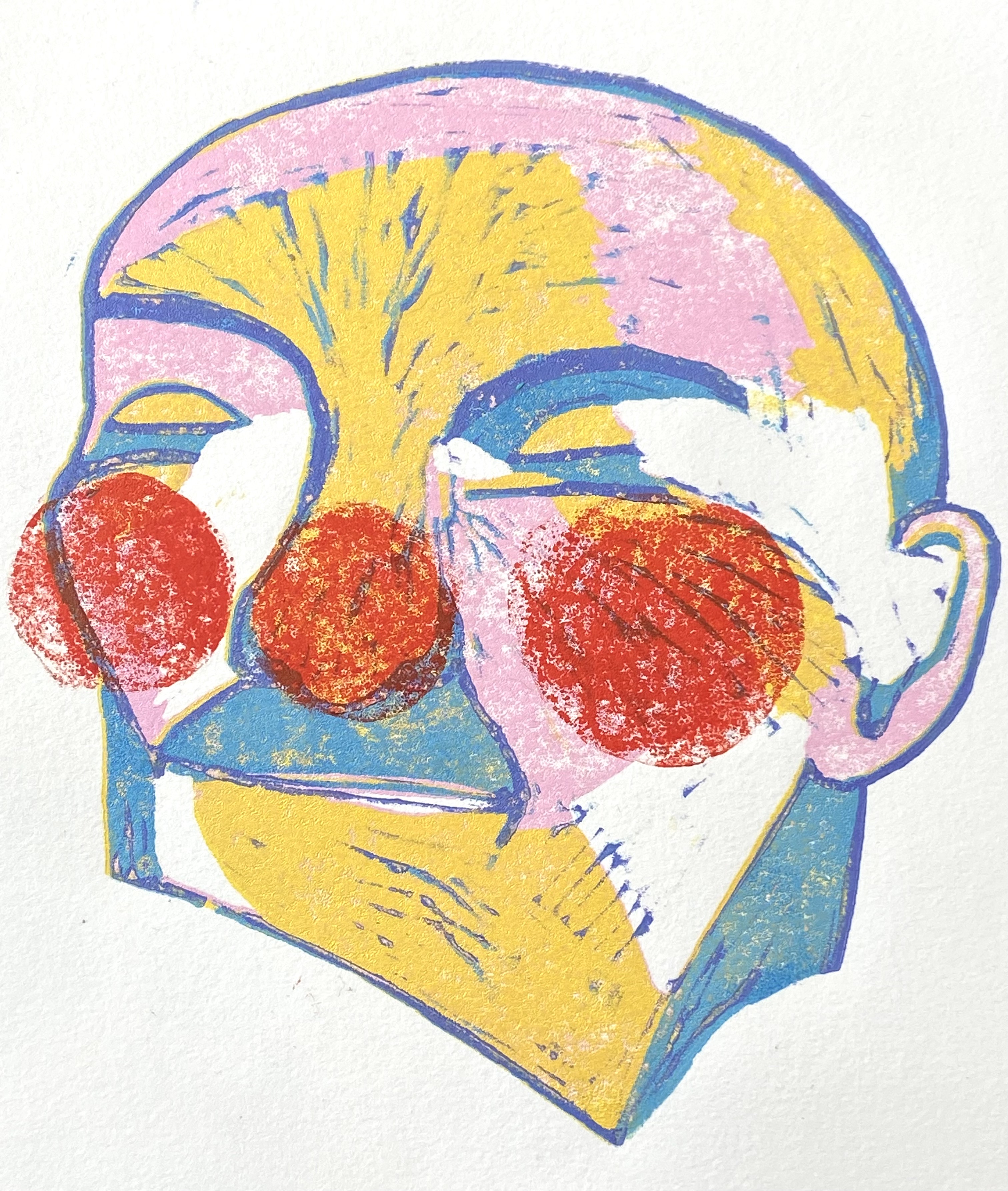 reduction linoprints, monoprints, linoprints with drawing and painting added and collages